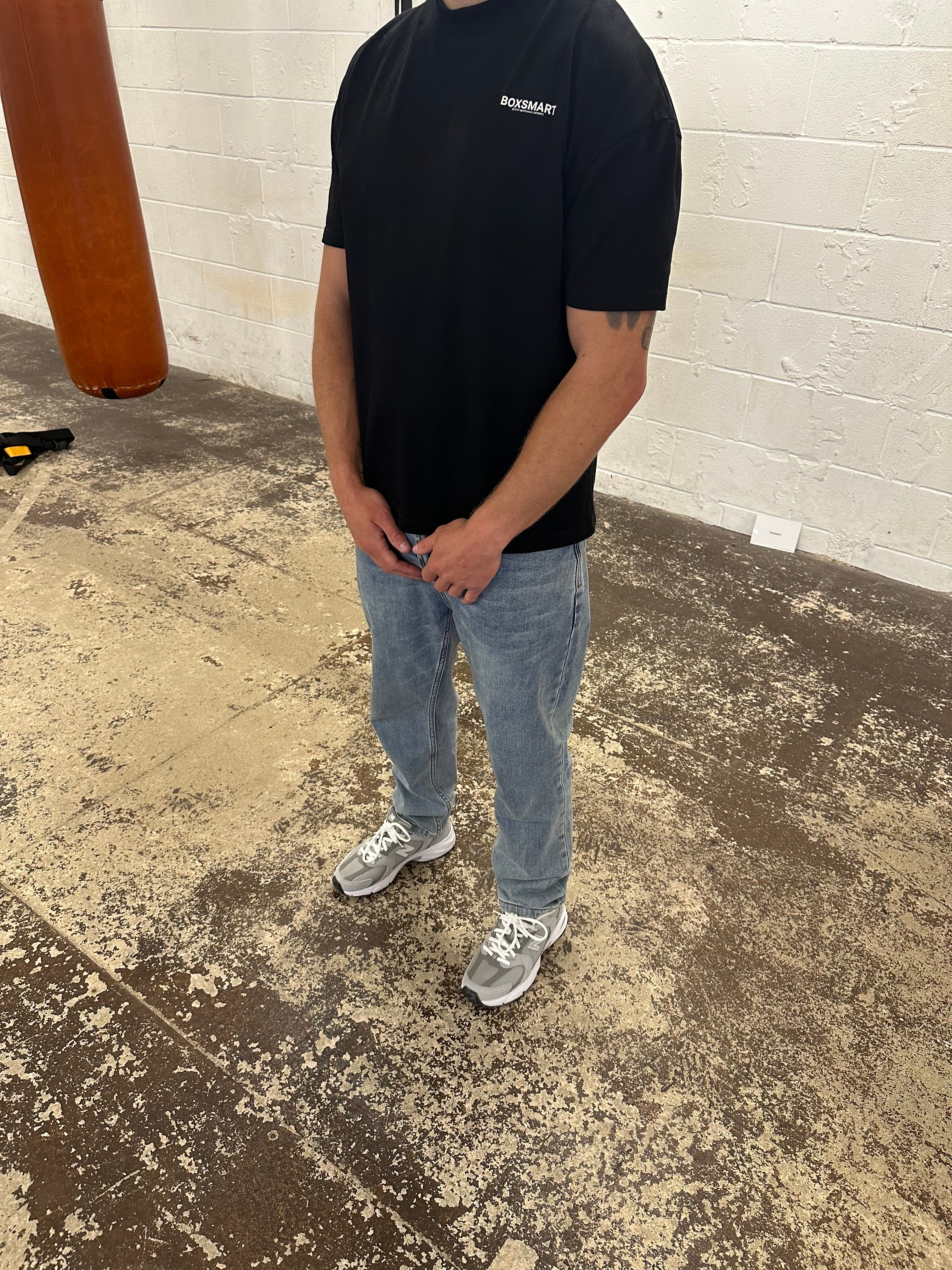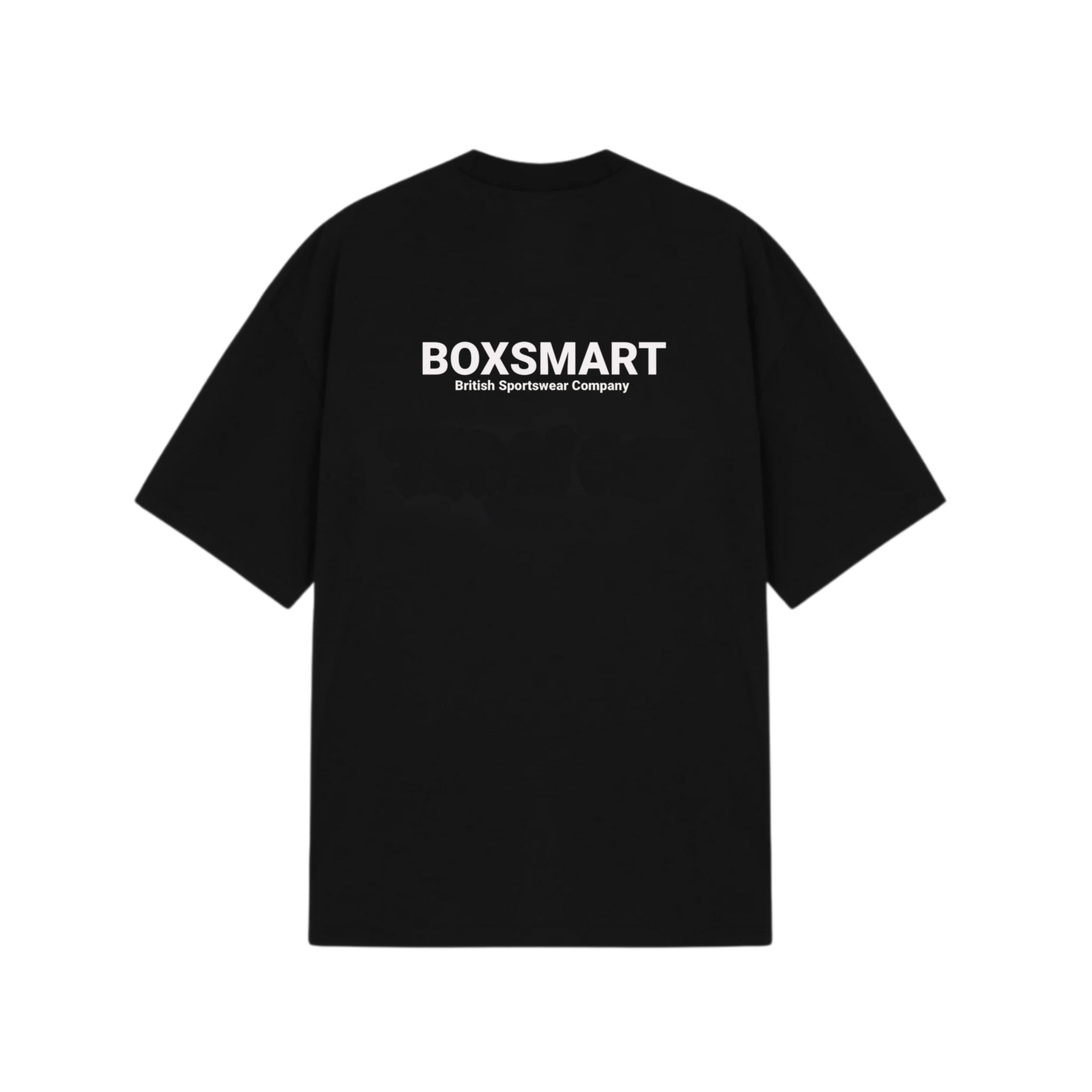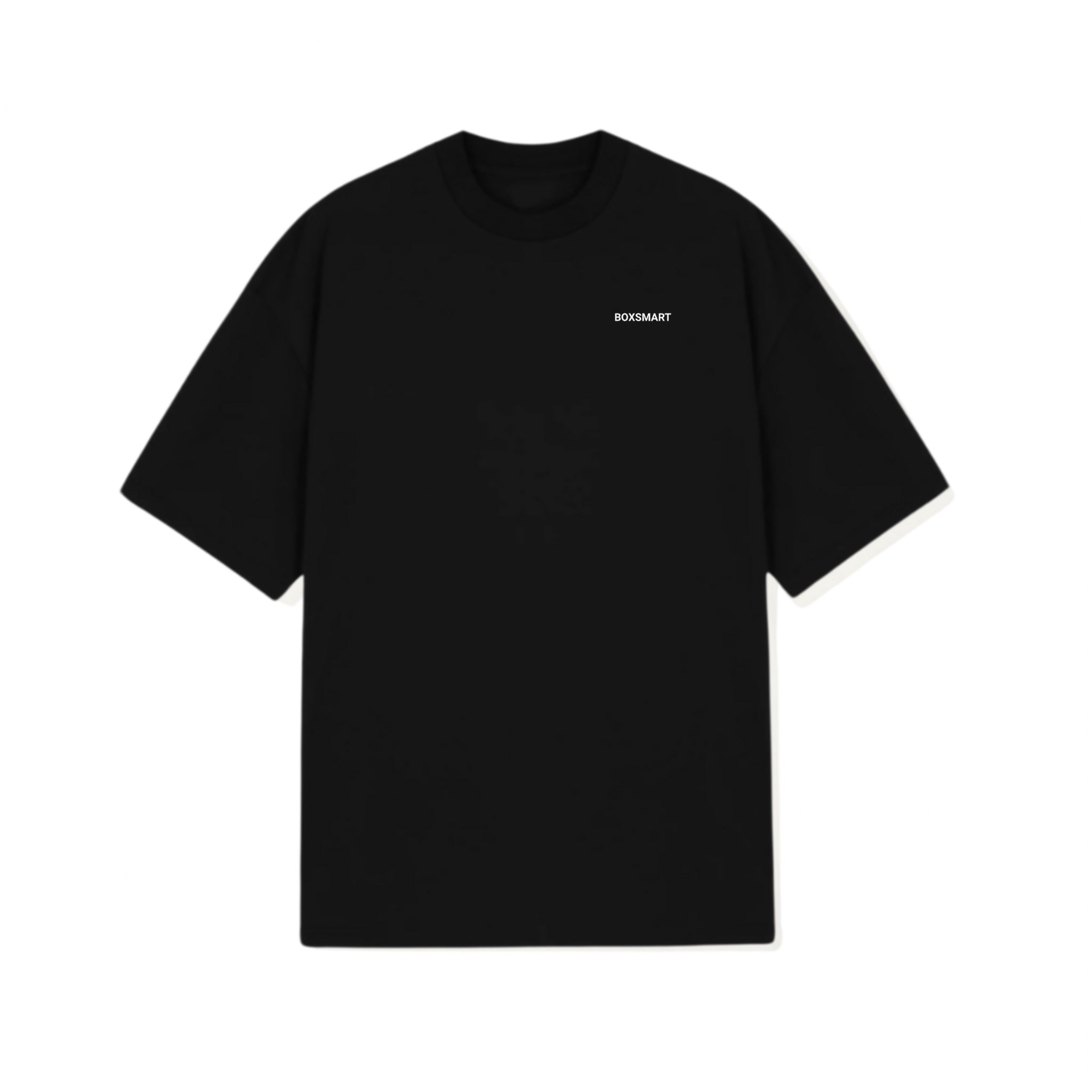 Our short sleeve jersey t-shirt in jet black is an oversized fit in a medium weight cotton. Ribbed crewneck collar. Boxsmart branding on the back and left chest.