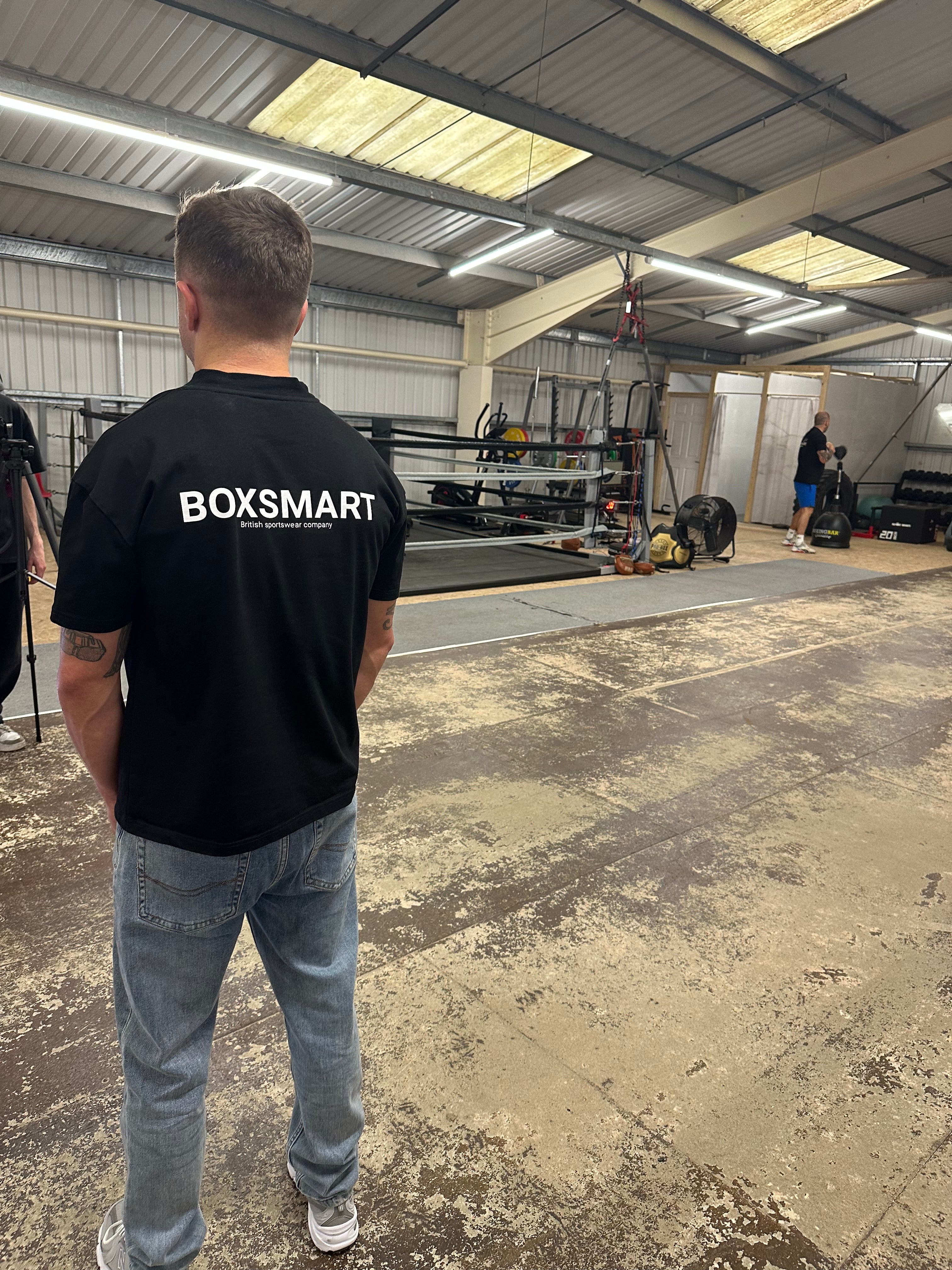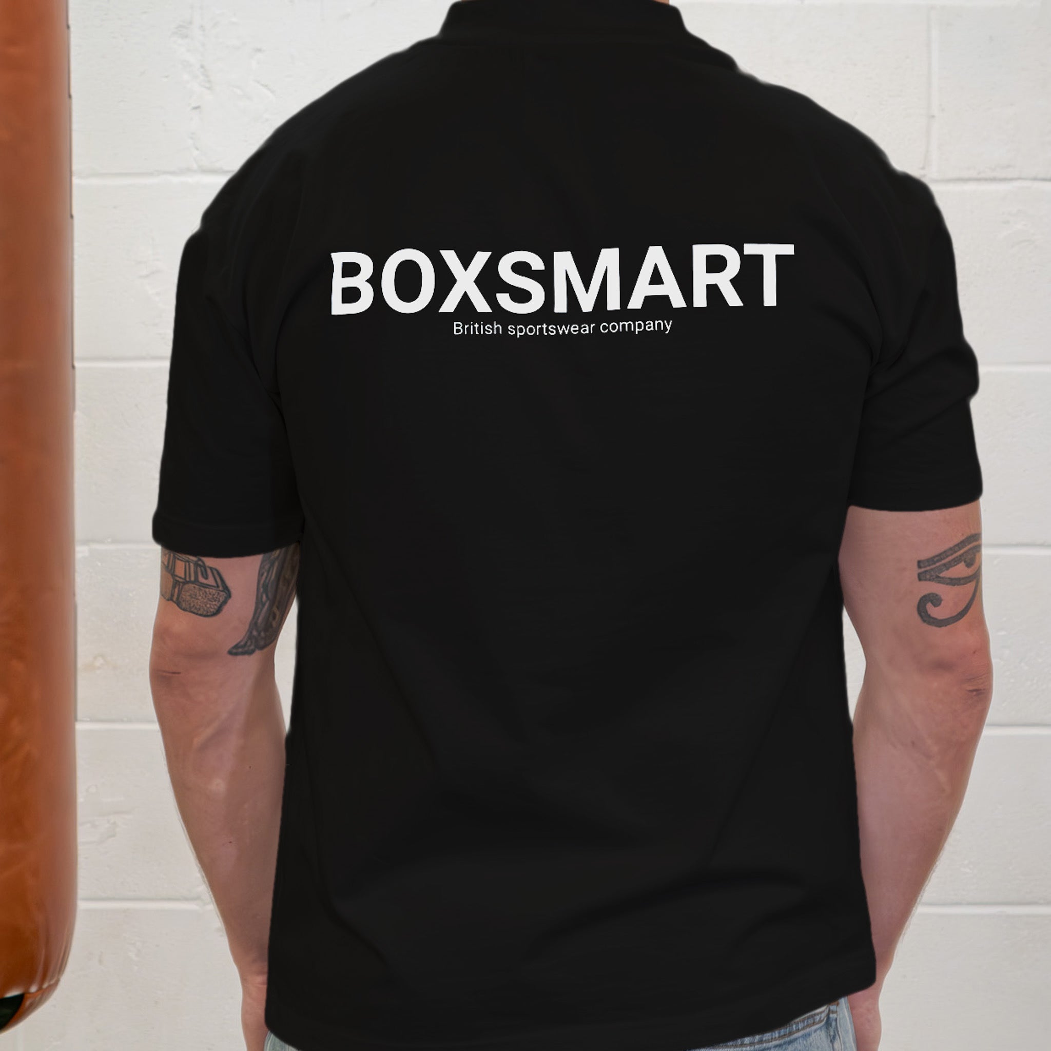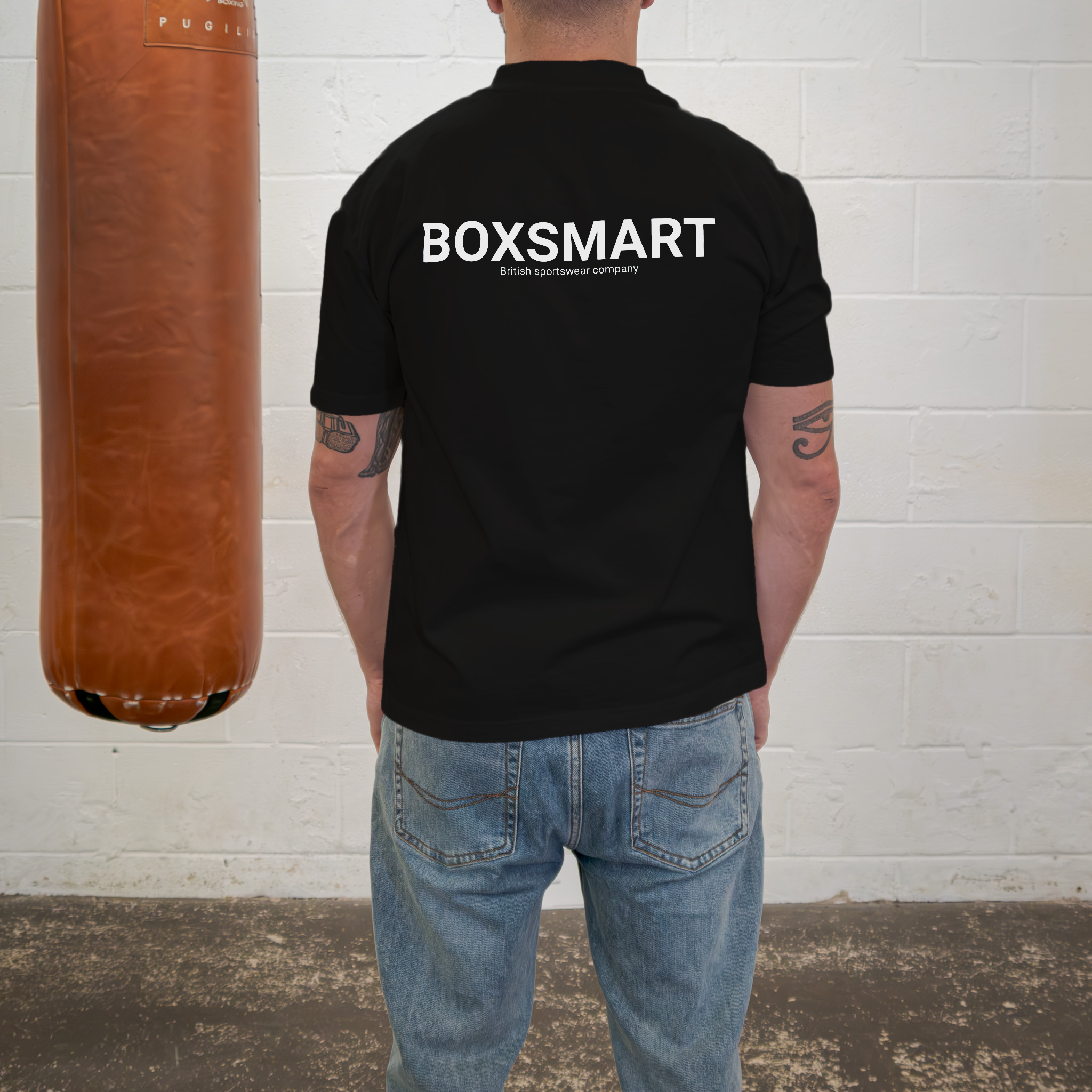 Our short sleeve jersey t-shirt in jet black is an oversized fit in a medium weight cotton. Ribbed crewneck collar. Boxsmart branding on the back and left chest.