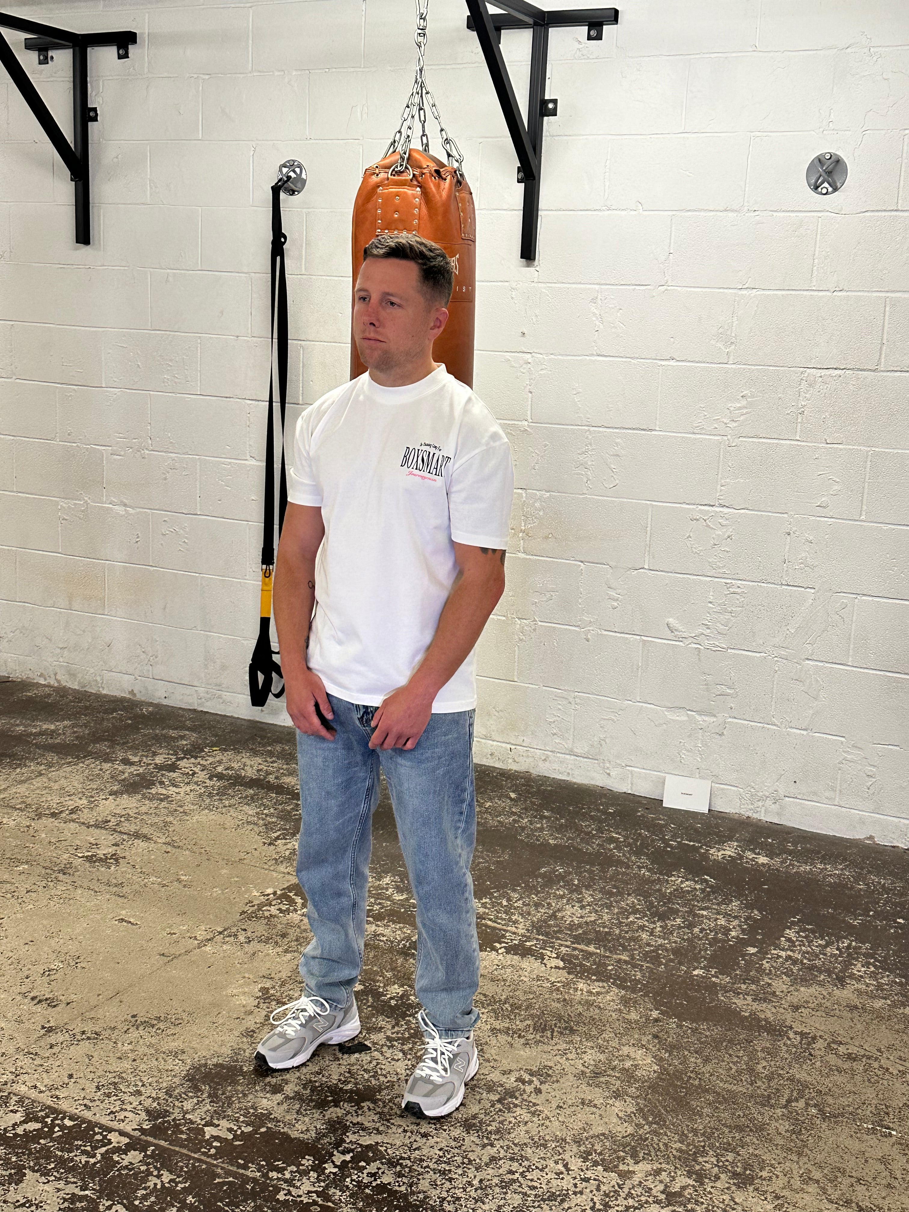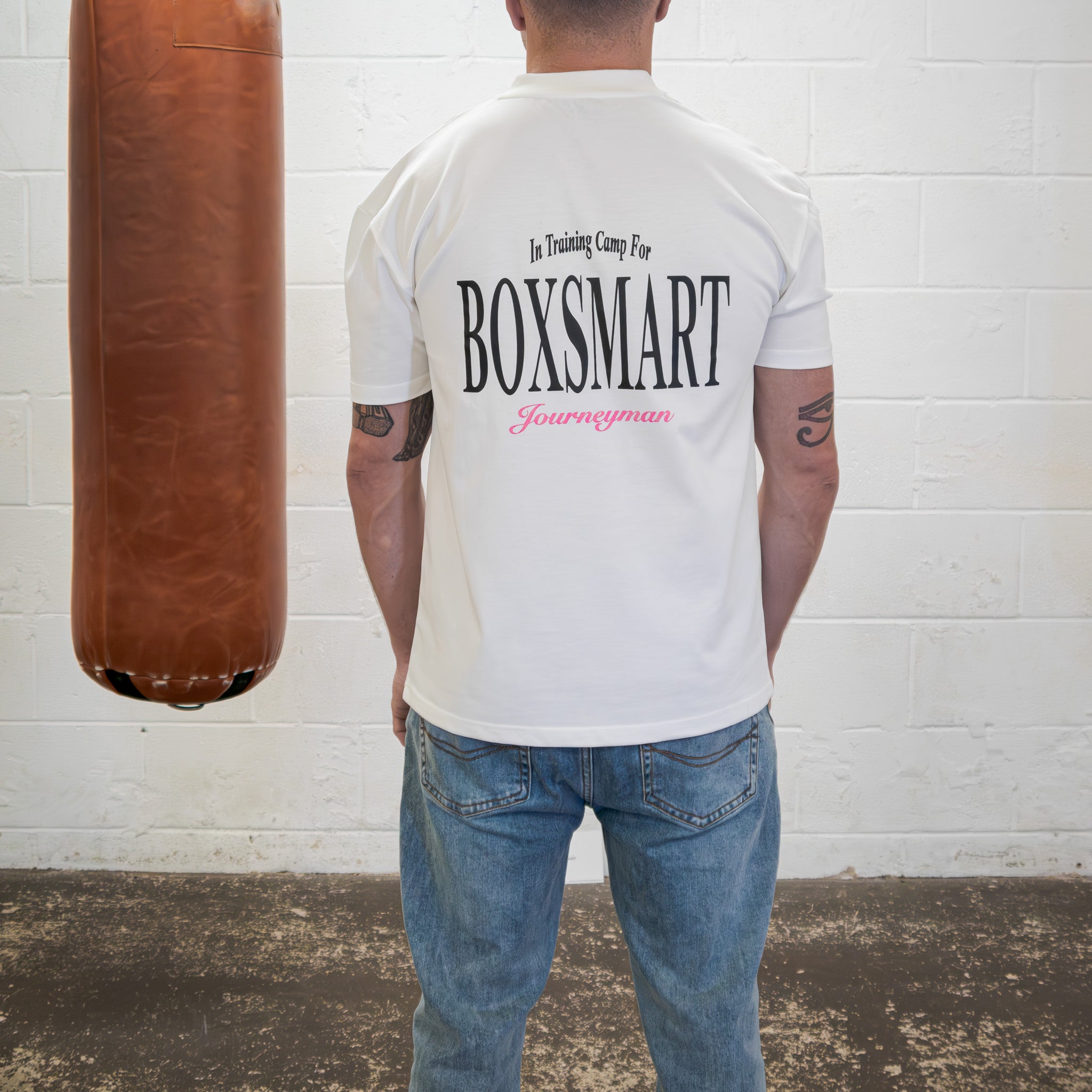 Our short sleeve jersey t-shirt in white is an oversized fit in a medium weight cotton to maintain its luxury aesthetic. Ribbed crewneck collar. Boxsmart branding on the left chest and centre back.