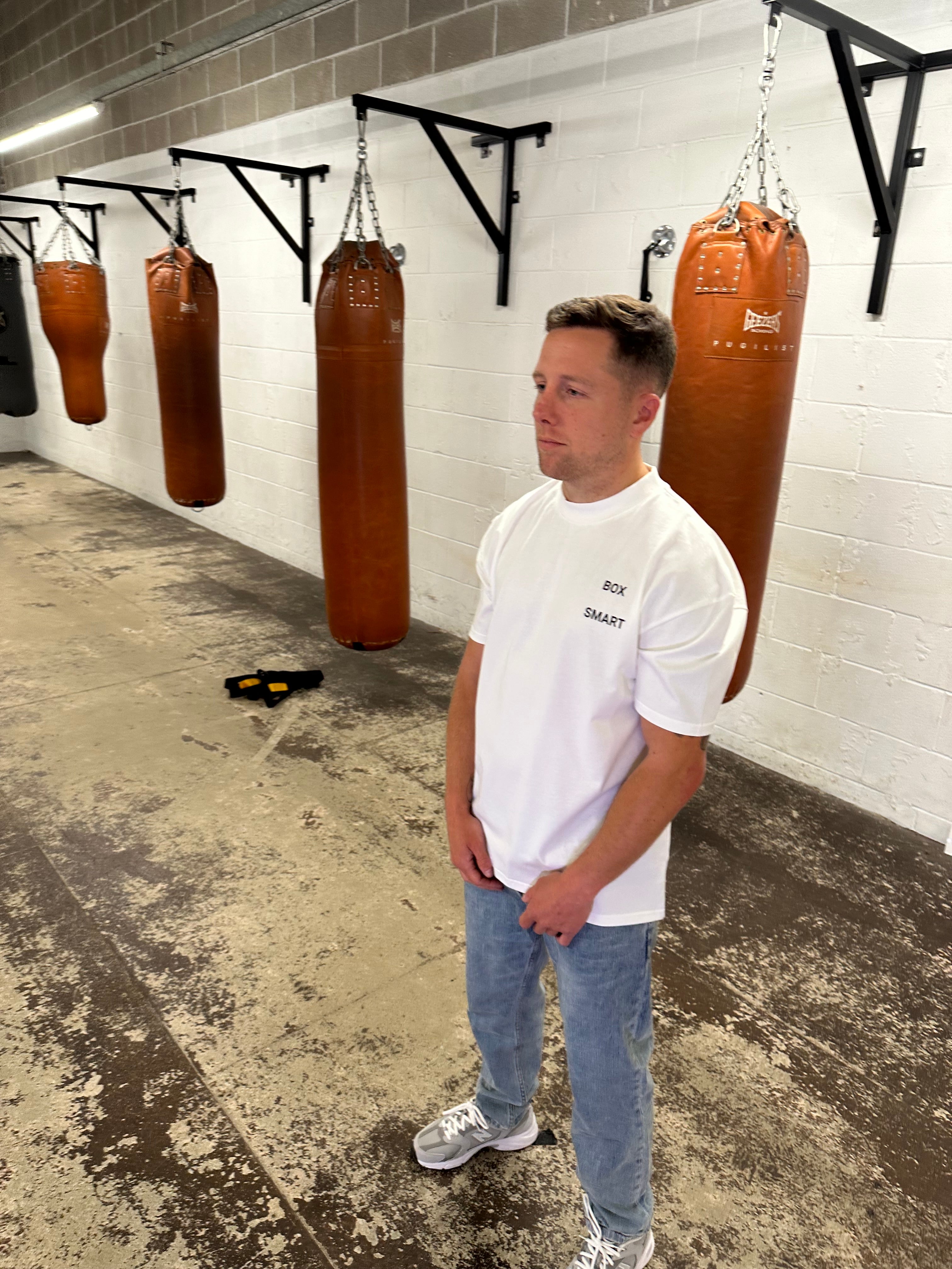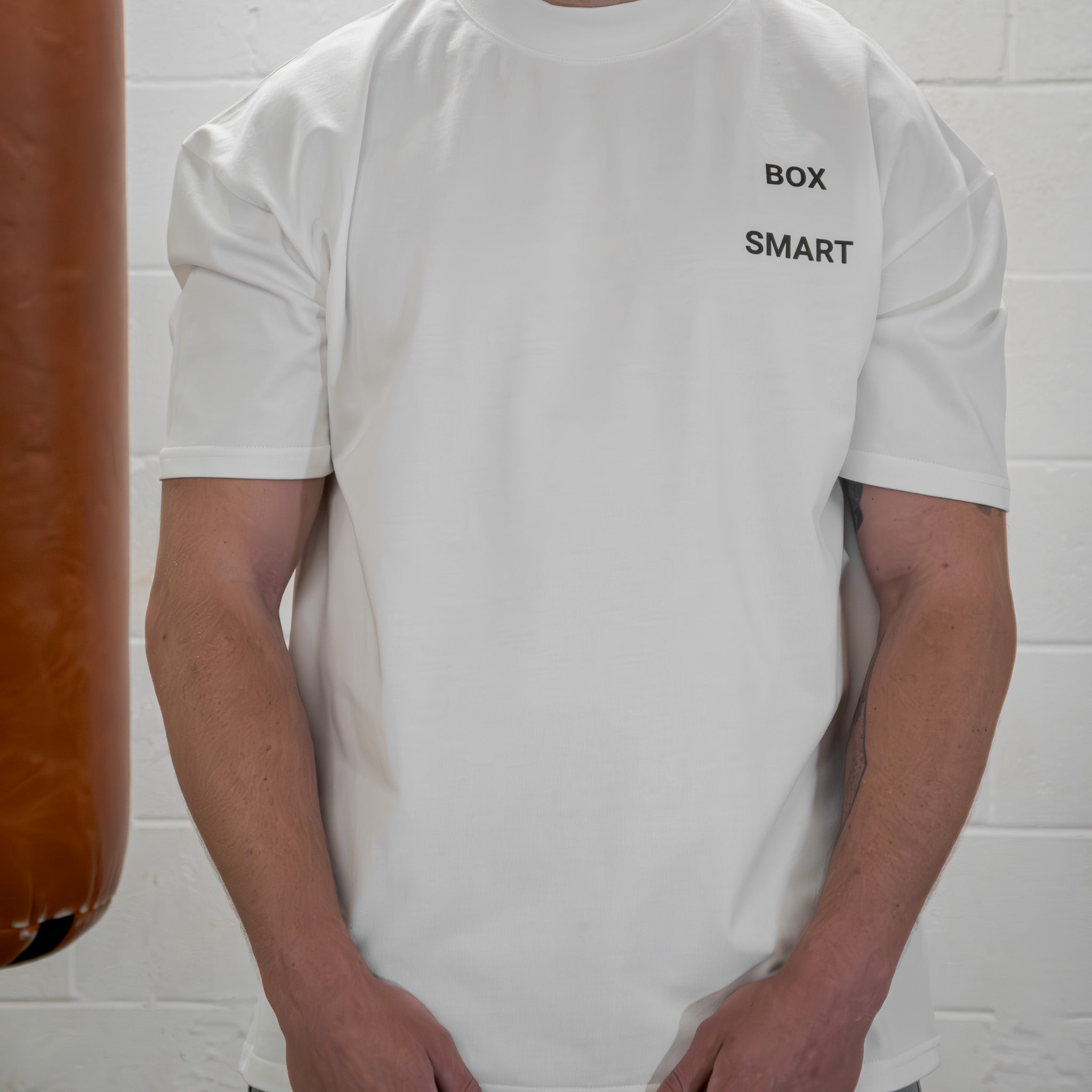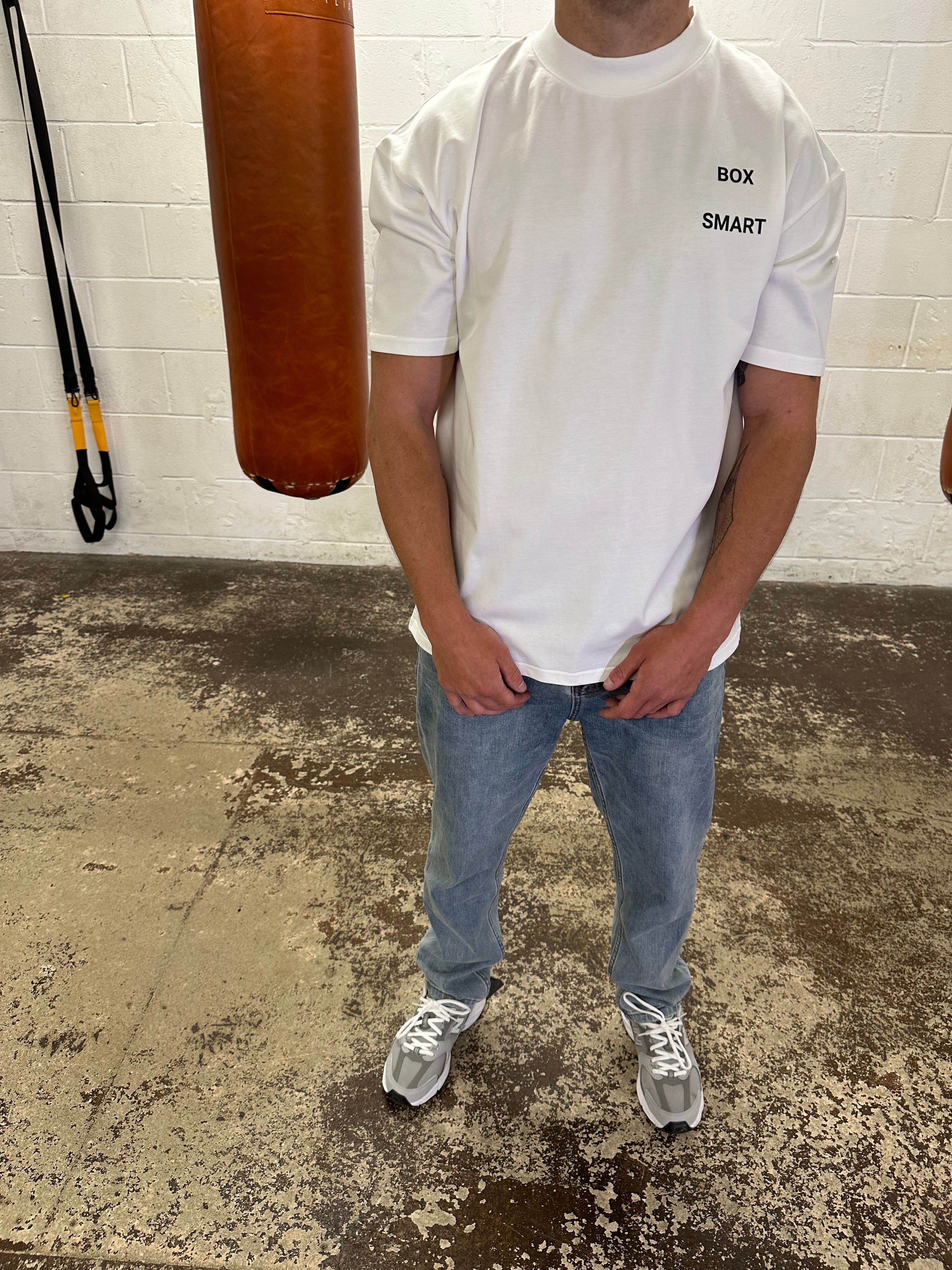 Our short sleeve jersey t-shirt in off white is an oversized fit in a medium weight cotton. Ribbed crewneck collar. Broken Boxsmart branding on the left chest.