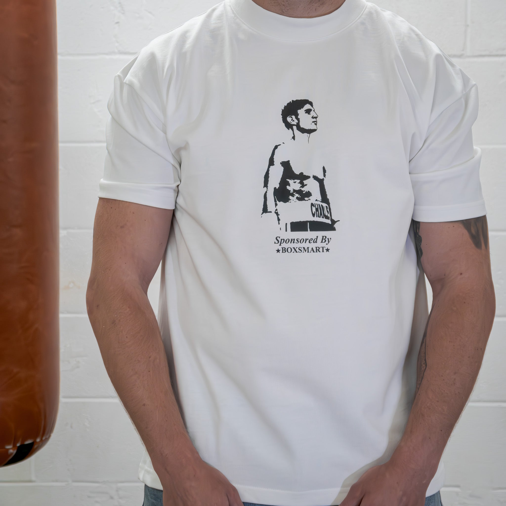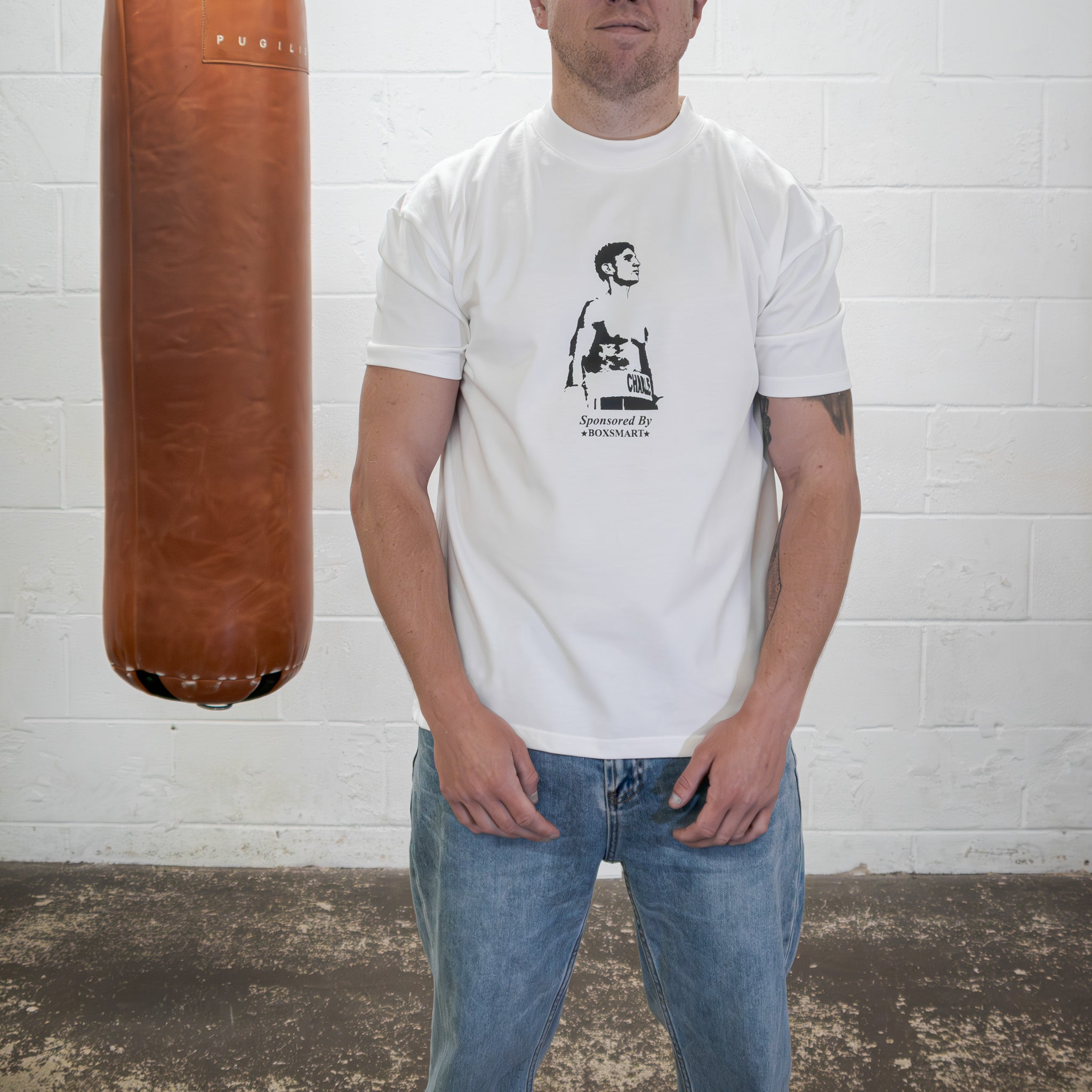 Our short sleeve jersey t-shirt in white is an oversized fit with tapered short sleeves. Made with a medium weight cotton to maintain a luxury feel. Ribbed crewneck collar. Boxsmart branding on the back and chest.
